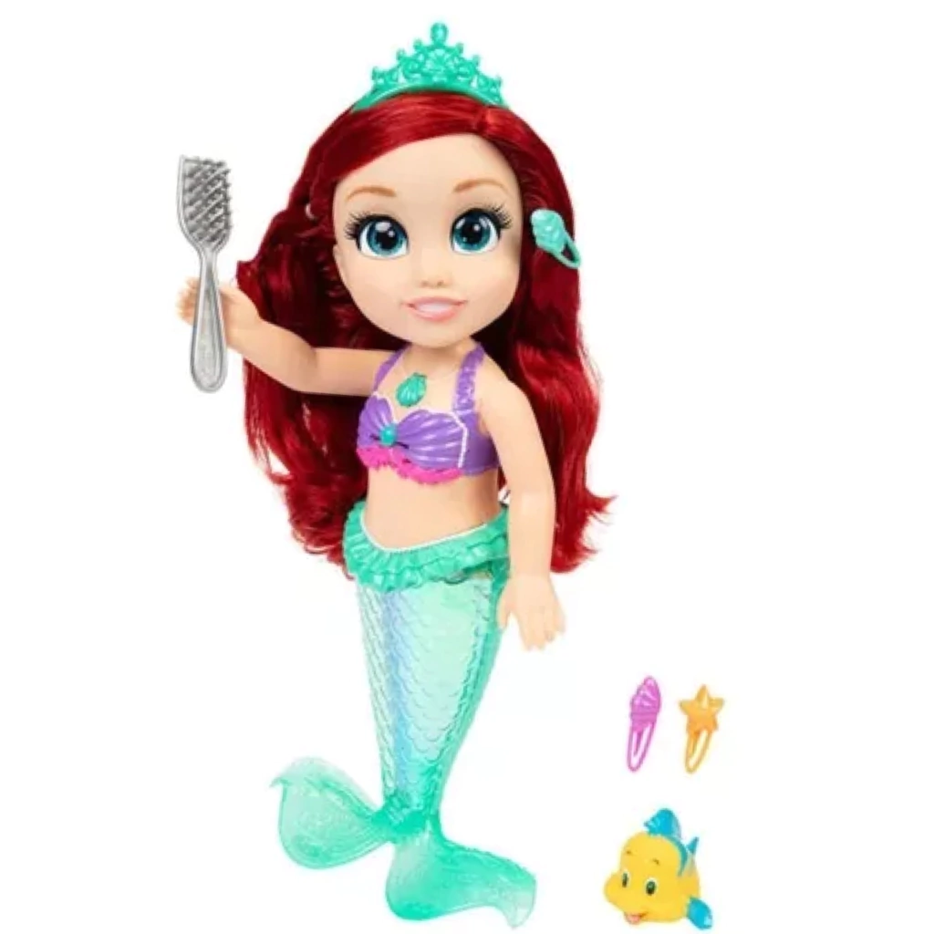 • INCLUYE: 1 muñeca Ariel, 1 peine para el cabello , 3 pinzas para el cabello con figuras marinas y 1 figura de juguete de baño Flounder
