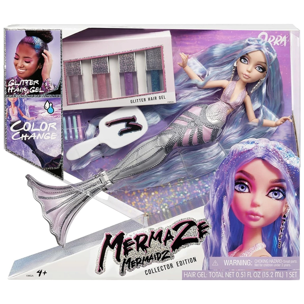 Mermaze Mermaidz deluxe Orra viene con accesorios para el cabello que incluyen los siguientes: 4 geles para el cabello con purpurina, 5 horquillas y un cepillo para crear tantos hermosos peinados de sirena con su cabello extra largo, fluido y colorido. También puedes combinar Orra utilizando el gel de cabello con purpurina en tu propio cabello. Luego, lava la purpurina y hazla una y otra vez. Cola y vestido que cambian de color La cola y el vestido de Orra cambian de rosa degradado y plateado a negro impresionante cuando entra en contacto con agua helada. Cola y vestido únicos esculpidos Orra tiene una cola y vestido únicos esculpidos con un acabado iridiscente y toques de purpurina multicolor. La cola se dobla como soporte Su cola también se dobla como soporte: levántala vertical con su aleta hacia abajo, o gira cada lado de su aleta para otra forma de pararse. Accesorios para el cabello incluidos Orra viene con accesorios para el cabello que incluyen los siguientes: 4 geles para el cabello con purpurina, 5 horquillas y un cepillo para crear tantos hermosos peinados de sirena con su cabello largo, fluido y colorido.