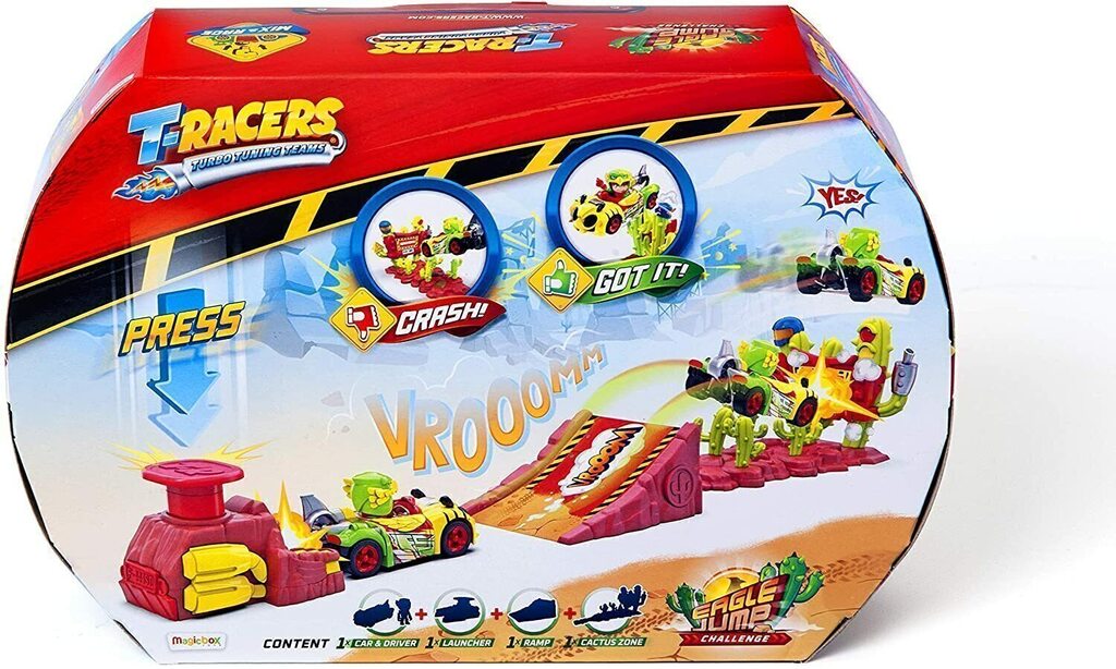 Disfruta con el lanzador de T-Racers Eagle Jump donde podrás lanzar el coche de Wing Speed a velocidades increíbles y podrás realizar hasta más de 500 combinaciones con los vehículos T-Racers hasta conseguir coches totalmente únicos y exclusivos para lanzarlos con el playset Eagle Jump